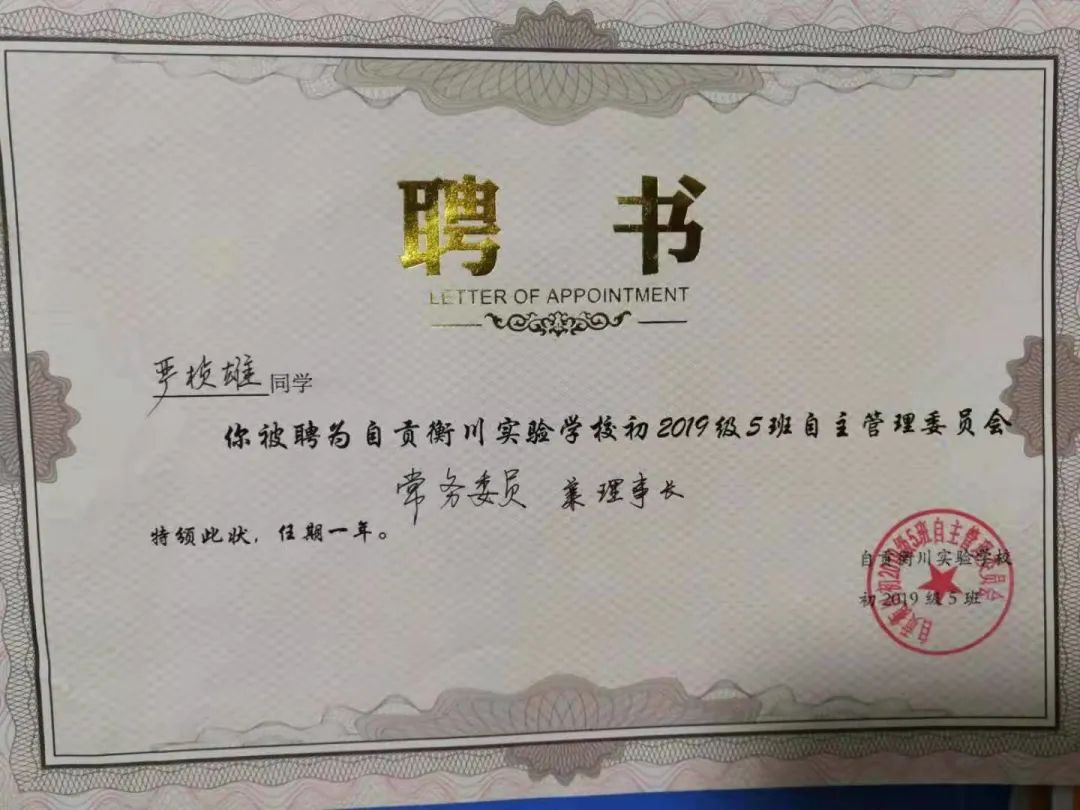 嚴(yán)楨雄于2018年9月入讀自貢衡川實(shí)驗(yàn)學(xué)校六年級(jí),于2019年9月升入學(xué)校初中,現(xiàn)為學(xué)校初二(5)班學(xué)生。