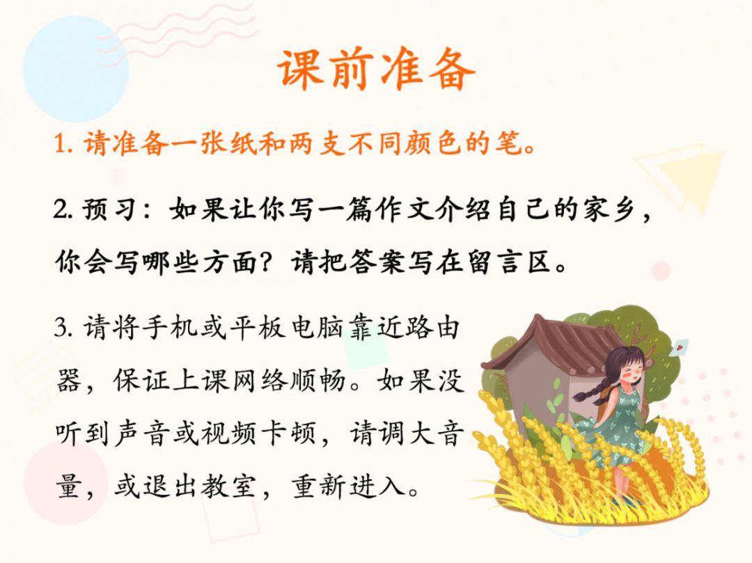 比如說(shuō)這節(jié)課是下午三點(diǎn)開(kāi)始,在2點(diǎn)50的時(shí)候,您就可以上線(xiàn)了,您可以提前10分鐘做一張PPT,把今天的預(yù)習(xí)內(nèi)容,以及網(wǎng)絡(luò)條件怎樣才能保持通暢的注意事項(xiàng)發(fā)給孩子們。