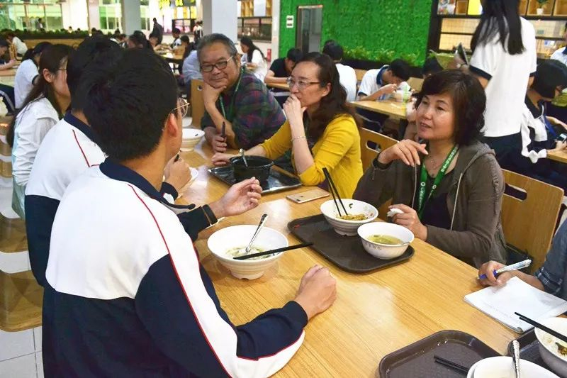 “你們喜歡吃什么菜???”肖校長(zhǎng)親切的問(wèn)道。“我最愛(ài)吃雞扒飯”“我愛(ài)吃鐵板飯”“我們把只吃肉,不愛(ài)吃青菜的同學(xué)叫做玉皇大帝(粵語(yǔ)諧音)”大家邊吃邊聊,校長(zhǎng)被逗得哈哈大笑。