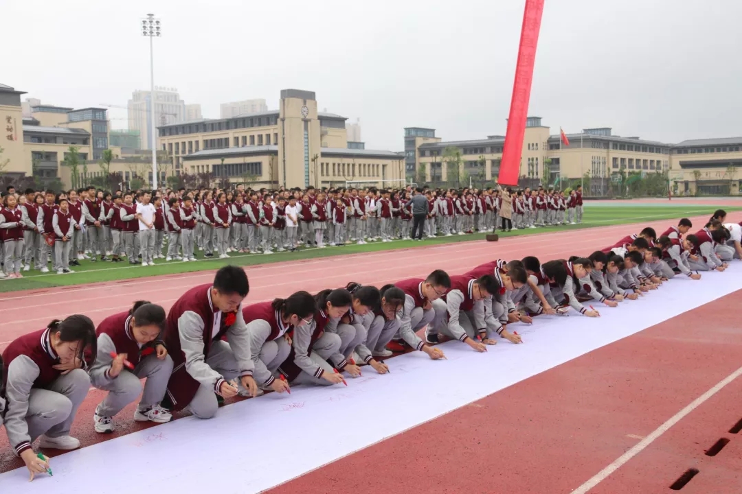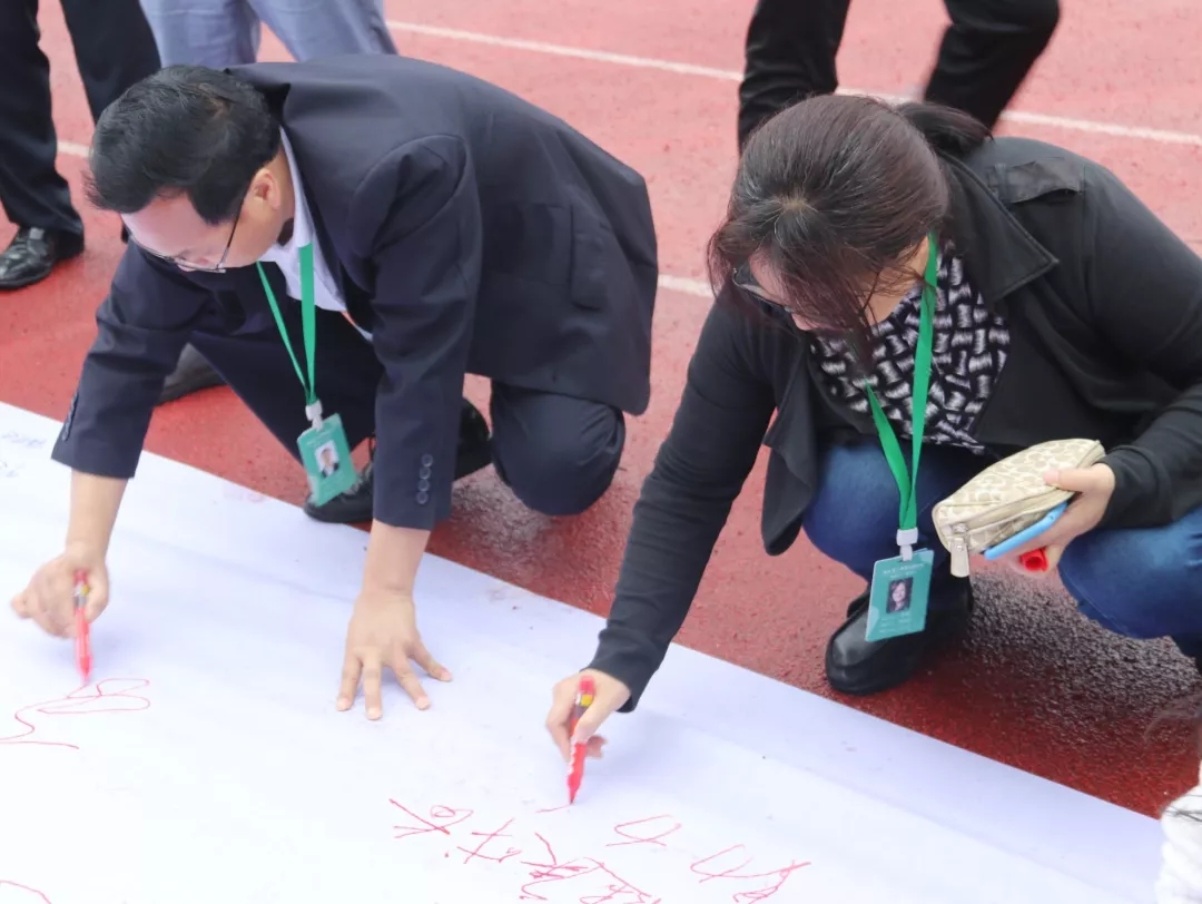 之后,師生們來到了百米長卷面前,用筆墨書寫了心聲和誓言。大家不忘初心,牢記使命。主席臺上,高一年級的張詩琪、曾伊萌、孔令羽和鄭暢同學(xué)為我們帶來了歌曲演唱《最初的夢想》。歌聲飄蕩在衡川運動場的上空,最初的夢想永遠在我們心中。