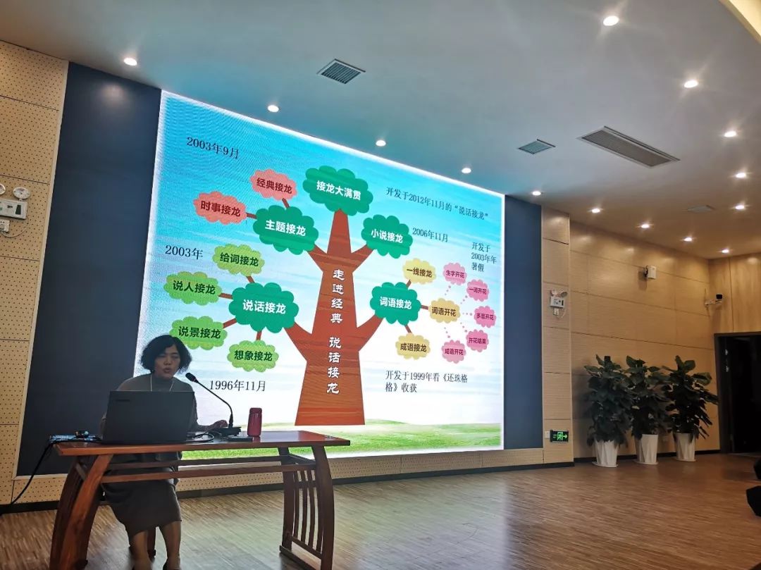 課堂結(jié)束后,丁老師又在階梯教室進行了《說話接龍之積累、激活、應(yīng)用》的講座,和老師們分享了“生字開花 ”“說話接龍”教學(xué)的意義和具體實施方法。