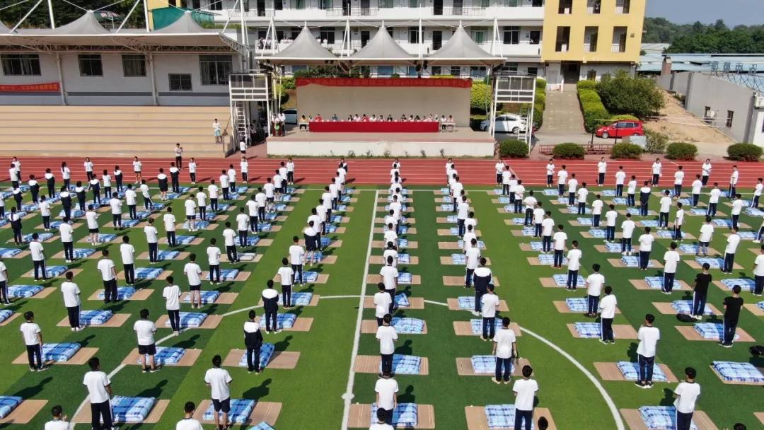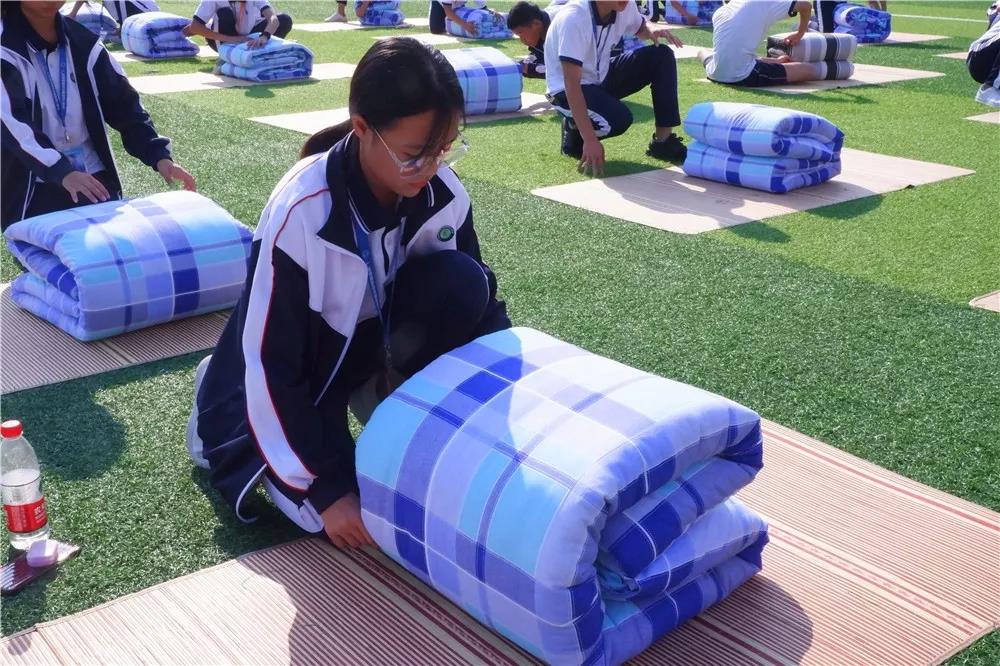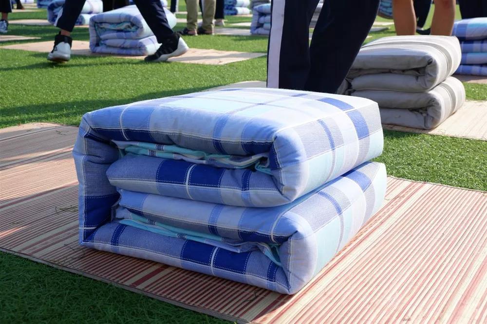 活動(dòng)開場,全體師生奏唱校歌,很快激烈的疊被子比賽開始了。比賽實(shí)行分組對(duì)抗淘汰制,三局定勝負(fù)。