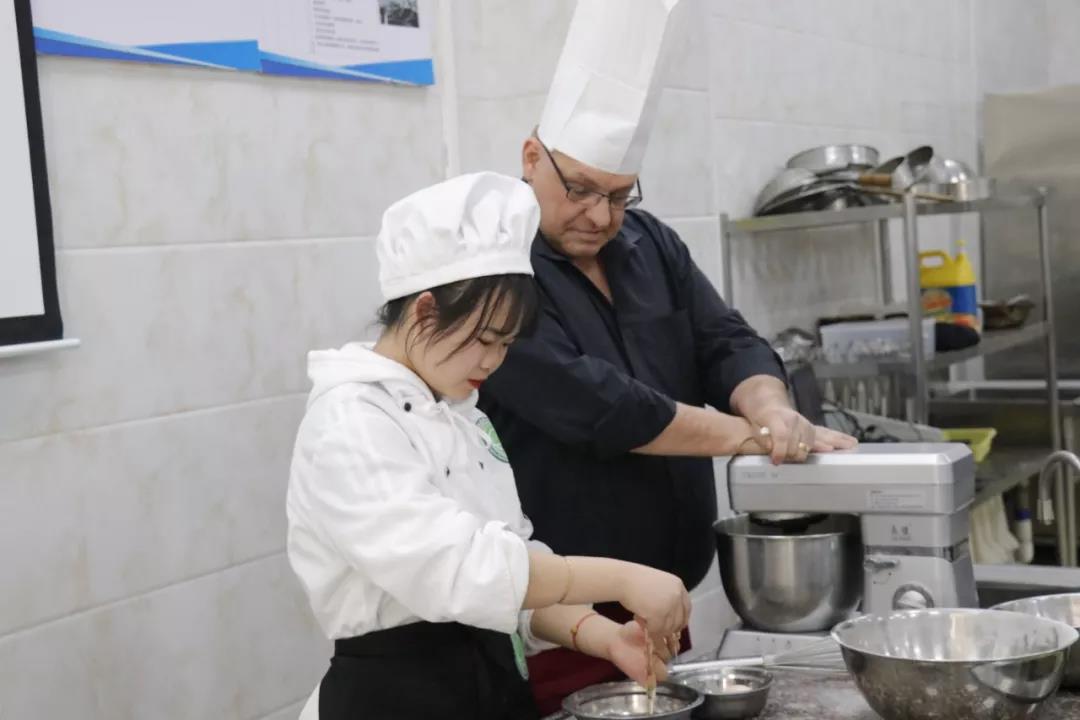 午后,Mr.Stuart一行觀摩烹飪班的面點實訓(xùn)課,Mr.Stuart興起,決定寓情于教,穿上烹飪專業(yè)圍裙,帶上廚帽,要親自教授18烹飪1的同學(xué)制作巧克力曲奇。EHI 校長親授,這群孩子有福。