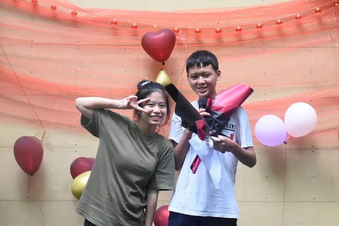 吃飽喝足便是節(jié)目表演環(huán)節(jié),老師的《日不落》活躍氣氛,現(xiàn)場(chǎng)成為打歌舞臺(tái),輕快酷炫的rap讓大家飽享耳福,搞笑有趣的廣西版《有何不可》讓大家捧腹大笑,熟悉的歌謠使得在底下的觀眾情不自禁地跟唱起來,小伙伴們組成一個(gè)個(gè)小團(tuán)隊(duì),在舞臺(tái)散發(fā)著獨(dú)具特色的光芒,歌聲夾著尖叫聲,打call聲響徹丫山,送花合影讓我們更親密了,每個(gè)人的臉上都洋溢著笑容,負(fù)責(zé)接送我們的劉老師最后也按捺不住了,唱起了動(dòng)聽的經(jīng)典歌曲《濤聲依舊》和《橋邊姑娘》。