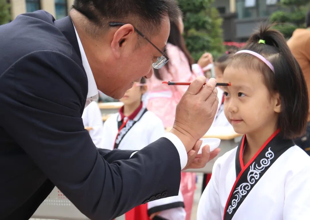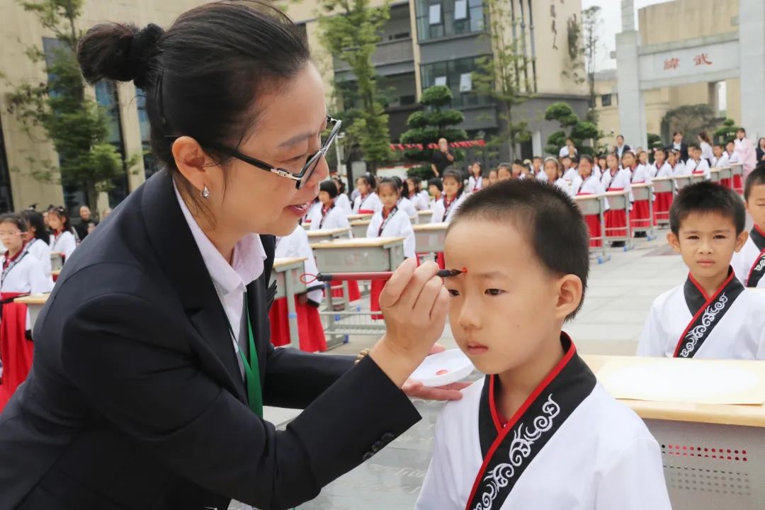 第二項由尹校長、徐校長帶領(lǐng)老師們給孩子們“啟智” ,一起將鮮紅的朱砂,在孩子們的額頭正中點痣,為他們開天眼。一顆顆紅痣在額上閃耀,飽含父母、長輩、學(xué)校的美好祝愿,在孩了們心中勾畫起一道道亮麗的風(fēng)景。