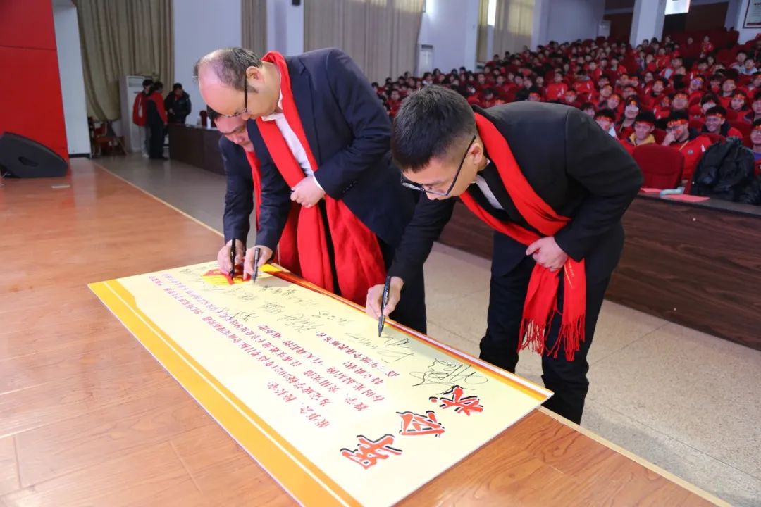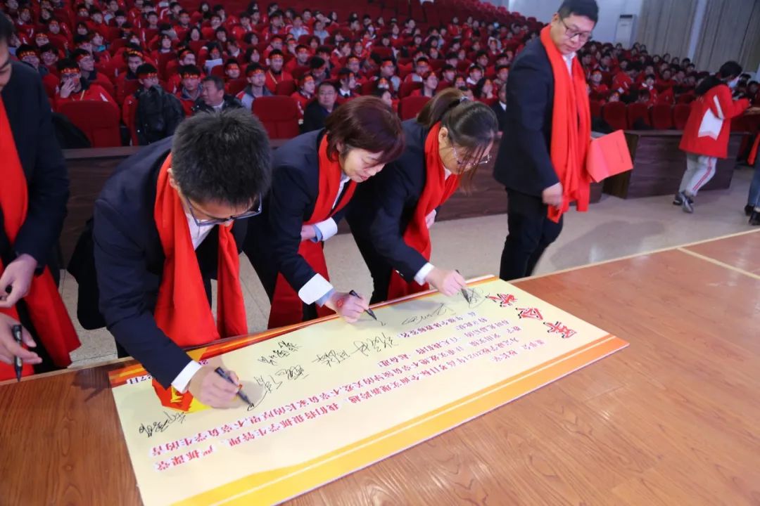 隨后,全體高三教師在張朝老師的帶領(lǐng)下簽軍令狀并宣誓。不負(fù)使命,認(rèn)真工作,甘為人梯,培育棟梁,關(guān)愛學(xué)生,創(chuàng)造輝煌,千淘萬漉雖辛苦,吹盡狂沙始到金,這就是高三教師的不變承諾!